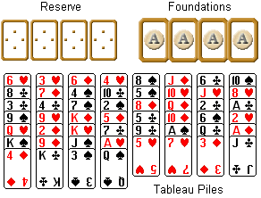 The game begins with dealing all cards to the tableau, arranged as eight stacks six or seven cards each. All cards are dealt face up. There are four reserve cells above the tableau. Initially they are empty.