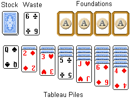 The game begins with dealing cards to the tableau, arranged as 7 stacks from one to seven cards each. The remaining cards form the stock. The waste pile is beside the stock.