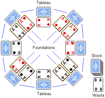 The object of the game is to build eight foundation piles up regardless of suit, running from Ace to Queen.