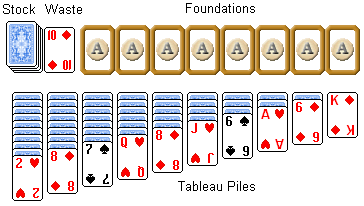 The game begins with dealing cards to the tableau, arranged as 10 stacks from ten to one cards each. The remaining cards form the stock. The waste pile is beside the stock.