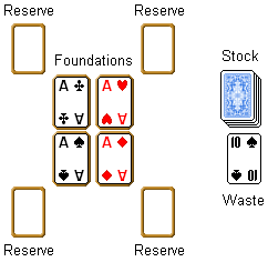 The game begins with dealing 4 Aces to the foundations in the center. The remaining cards form the stock. The four corner cells are the reserves. The waste pile is under the stock.
