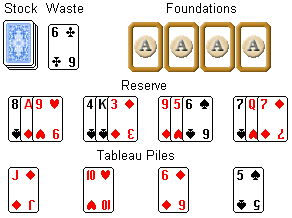 The game begins with dealing 12 cards to the four reserve cells. All of them are face up but only the top card is free to play. Then four cards are dealt to the four tableau cells. The remaining cards form the stock. The waste pile is beside the stock.