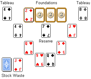 The Eagle Wing is a one-deck patience. The game is begun by dealing eight cards to the tableau. Four foundations are above the tableau. One more card is dealt to the first foundation to determine the starting rank (Two in Figure). 13 cards are dealt to the reserve pile. The remaining cards form the stock. The waste pile is beside the stock.