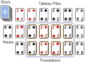 The game is begun by dealing eight Twos to the foundations. Then 10 more cards are dealt face up to the tableau cells. The remaining cards form the stock. The waste pile is under the stock.