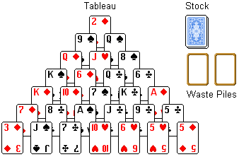 The Pyramid is a one-deck patience. The game is begun by dealing 28 cards to the tableau. The remaining cards form the stock. Two waste piles are under the stock.