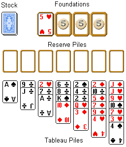 The game begins with dealing 28 cards to the tableau, arranged as seven stacks from one to seven cards each. All cards are dealt face up. One more card is dealt to the first foundation to determine the starting rank (Five in Figure). The remaining cards form the stock.