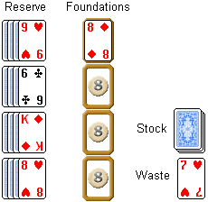 The Osmosis is a one-deck patience. The game is begun by dealing 4 cards to each reserve pile. One more card is dealt to the first foundation to determine the starting rank (Four in Figure). The remaining cards form the stock. The waste pile is under the stock.