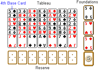 The game begins with dealing 49 cards to the tableau, arranged as 7 stacks of 7 cards each. All cards are dealt face up. Three cards of one rank are dealt to the foundations to determine the starting rank (Five in Figure). The remaining card of the starting rank (the beak) is dealt first to the left tableau column.