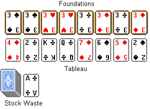 This game is a two-deck patience. The game begins with dealing eight Threes to the foundations. Then eight more cards are dealt face up to the tableau. The remaining cards form the stock. The waste pile is beside the stock.