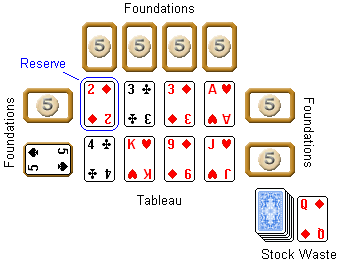 The Queens play a special role in this game. When a Queen is opened in the stock, three cards are moved from the bottom of the reserve to the bottom of the stock. When a Queen is played to the foundations or to the tableaus, five cards are moved instead.